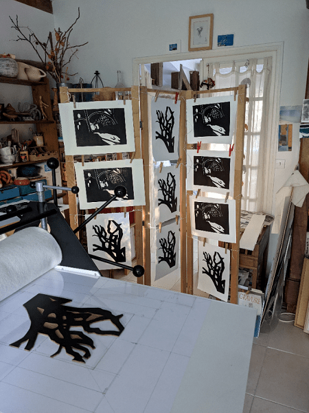 Greta Wehbé tire son inspiration de son environnement et dispose d’une presse et pourra ainsi faire une démonstration de tirage d’une plaque de lino.