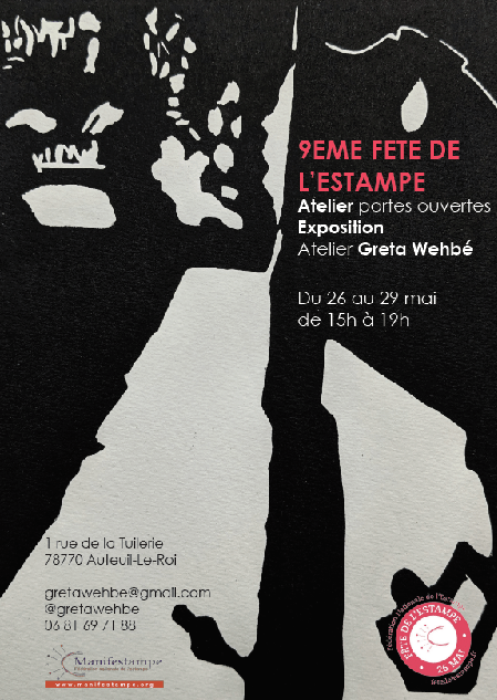 A l’occasion de la fête de l’estampe Greta Wehbé ouvre son atelier au public. L’entrée est libre : on peut y venir en respectant les gestes barrières (masque obligatoire, gel hydroalcoolique, distanciation, …) aux horaires d’ouverture indiqués sur l’affiche.