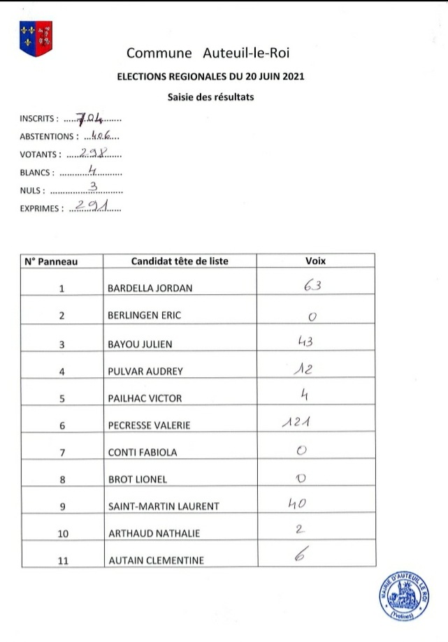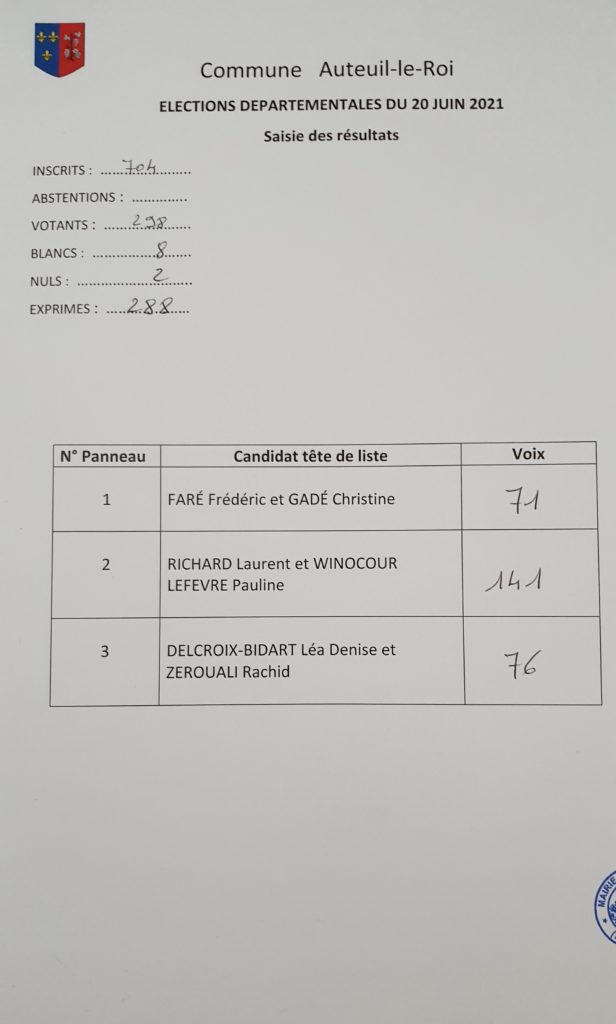 Suite aux élections départementales et régionales qui se sont déroulées le 20 Juin 2021, voici les résultats des votes réalisés sur la commune d’Auteuil-Le-Roi